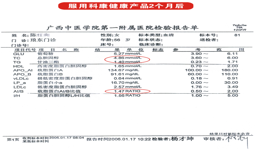 食用科康天然水蛭素2个月后,头晕症状已完全消失,睡眠也有很大改善,精神状态明显好转,面色也红润了很多。去医院复查血脂,血胆固醇4.86mm/L,甘油三酯1.40mm/L,载脂蛋白AI/B1.47RATIO,已完全降至正常水平。