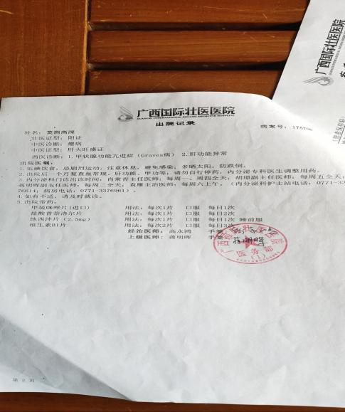 莫忠子,别名莫测高深,2020年1月份因生活各种压力过大,出现情感时而高涨躁狂,时而低落抑郁等现象去院检查,患上抑郁狂躁症。同年1月9号因颈部肿大伴心悸、手抖1年、心率180次/分、高血压等现象而住院治疗。经检查患上甲状腺功能亢进、肝功能异常。在药物的治疗下,3个月后心率降至130次/分而出院,出院时,医生说后续还须坚持服用治疗心率及甲亢的药物3-6年,每个月须回院检查,后因药物副作用大,在坚持了几个月后,就没在继续服用药物,因此,心率也一直没恢复至正常。
