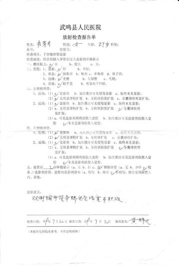 治疗1个月后复查“白带支原体阴性”,第2月月经干净1天,行双输卵管通液,已经完全疏通。