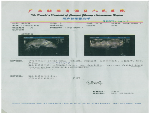 患者2年前开始月经紊乱,月经周期不等,最长半年,最短2月余,月经量不等,2009年曾多次在外院用中药调理,但效果欠佳,具体药物不详。为进一步治疗而就诊,B超显示卵巢多囊,体格检查正常,复查外阴正常,阴道通畅、宫颈光滑、子宫前位略小、双附件未触及包块。诊断:1、双侧多囊卵巢综合症 2、先天子宫偏小。处理: 水蛭素多肽蛋白片(天然水蛭素)3瓶 用法:2片/次 3次/天