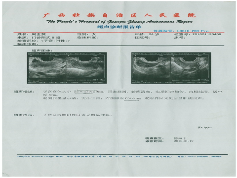经两个月调理复查,B超显示子宫大小52×47×29mm,子宫及双侧附件区未见明显肿块。月经周期和经量正常。