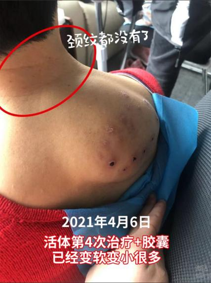2021年了解到天然水蛭素后,决定试一试,第一次水蛭活体调理(3条),开始服用胶囊,每天口服9粒,一周以后继续水蛭活体调理(7条),3月29日第三次活体调理(7条),4月6日第四次活体调理(7条),经调理及服用胶囊3瓶后,现在颈部包块已明显变软变小,堆积的颈纹也随之消失了。