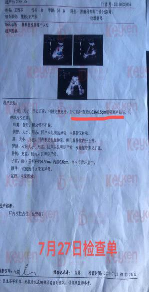 鼻咽癌二次复发,2020年7月27日体检发现肝右后叶查件约0.8x0.5cm稍强回声结节,当月接触到天然水蛭素胶囊并开始服用。