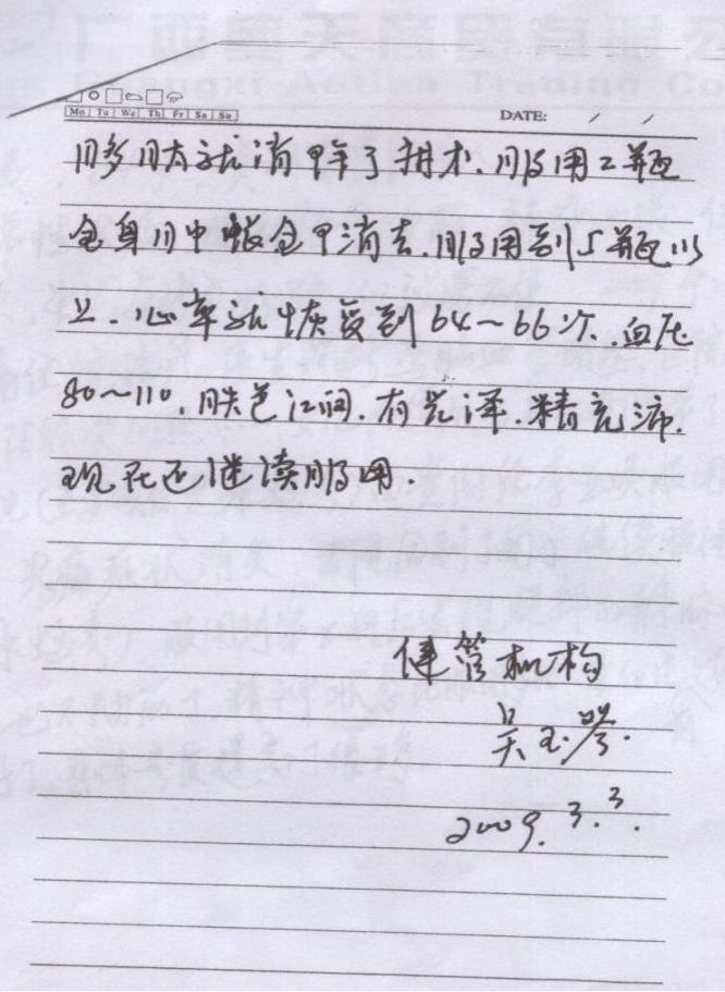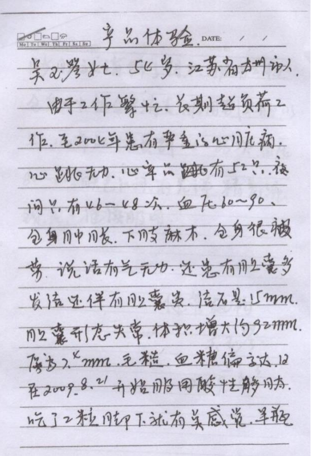 患有严重的心脏病,心跳无力,心率只有52次,夜间只有46-48次,血压60-90,全身肿胀,下肢麻木,全身很疲劳,说话有气无力。还患有胆囊多发结石伴胆囊炎,结石15mm,胆囊形态正常,体积增大约92mm,厚度7.4mm,毛糙。血糖高达12mm/L。