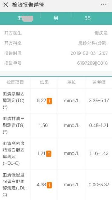 食用前: 血脂四项检查结果,总胆固醇:6.22mmol/L、甘油三酯:1.50mmol/L